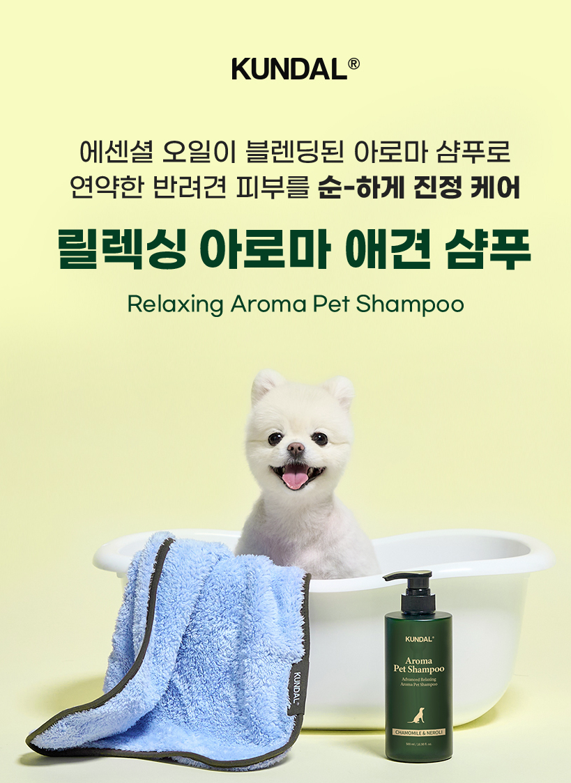 첫 번째 소개할 제품은 쿤달 어드밴스드 릴렉싱 아로마 애견샴푸입니다. 장모종, 단모종 모두 안심하고 쓸 수 있는 '동물용 의약외품 신고완료' 제품이라고 합니다. 평소 각질이 많고 건조한 피구가 고민이었던 우리 강아지들은 모두 딱 맞을 것 같습니다. 약알카리성으로 건조한 피부에 수분보호막을 형성하고, 함유된 오일이 엉킴 없는 부드러운 털로 만들어 줍니다. 자극이 적은 은은한 향과, 충분한 보습력을 자랑하고 있습니다. 또한 전 성분이 미국 비영리 기관인 EWG에서 그린 등급 원료를 사용하기 때문에 믿고 사용하셔도 됩니다.