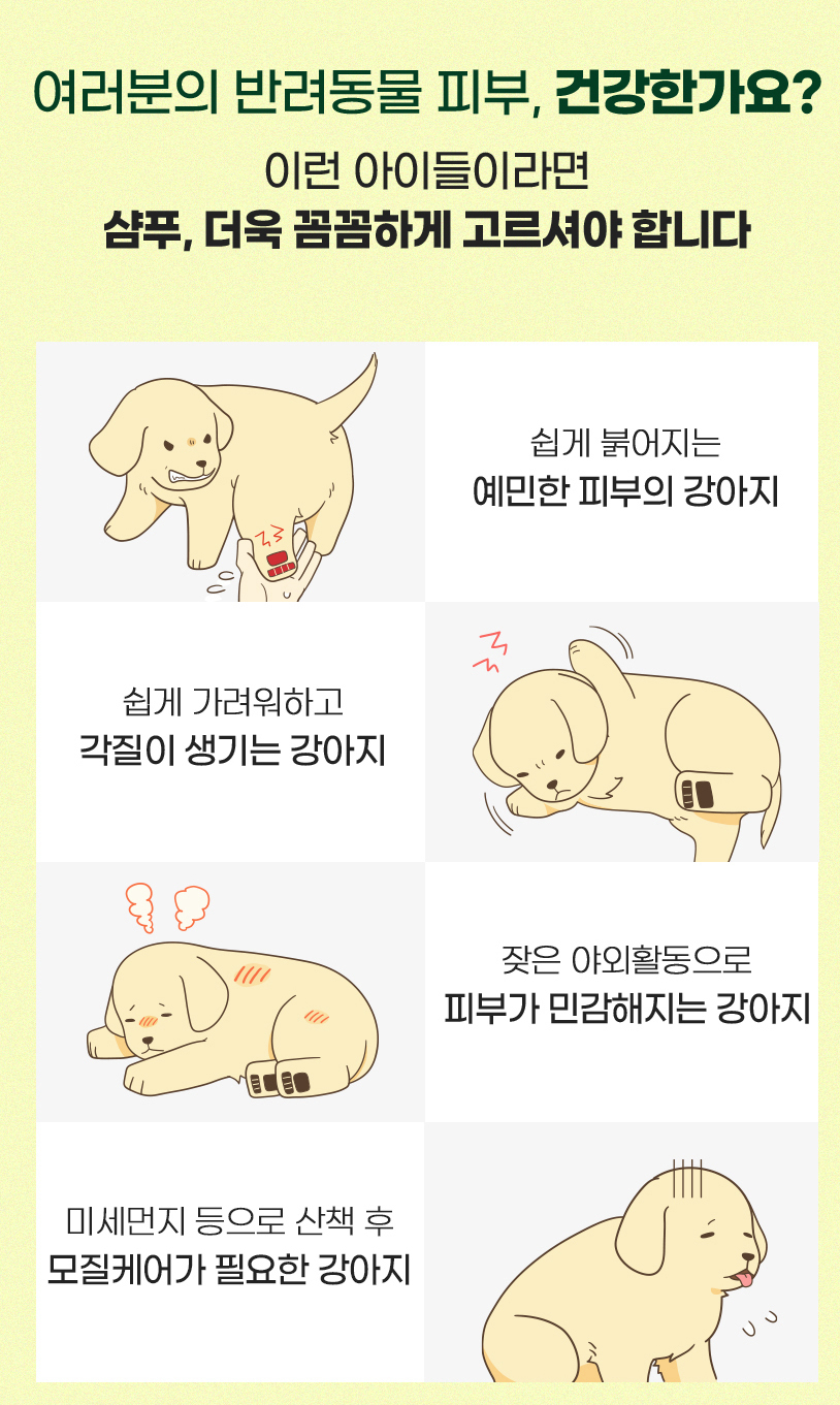 20여 년간 강아지와 고양이를 보호해 오면서 노령화 및 건강 악화 시 가장 먼저 나빠지는 강아지 피부를 경험하면서 제작하게 된 반려동물용 전용 샴푸입니다. 피부가 나빠지는 데는 여러 이유가 있지만 보호자와 함께 살아가면서 접촉하게 되는 400회 이상의 샴푸도 그 원인이 될 수 있다는 것에 주목하여 안전한 원료를 담아, 핥고, 흡수되는 문제까지 생각한 제품으로 기존