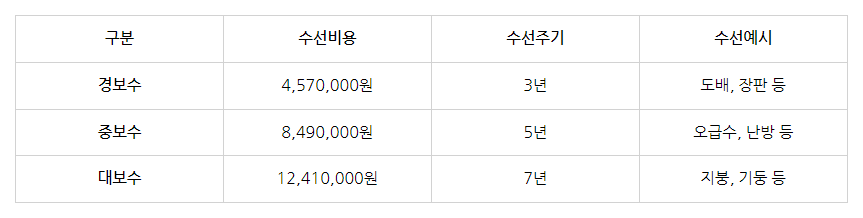 자가가구에는 주택의 노후도에따라서 도배, 난방, 지붕 등의 수리비를 지원 받을 수 있습니다. 단 현금으로 지급되지 않으며 경보수, 중보수, 대보수 3가지로 구분하여 그에 따라 수선비용 및 수서주기 등이 차등 적용됩니다.
