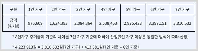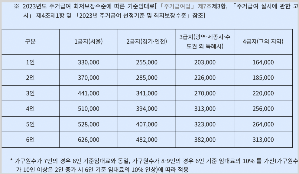 2023 주거급여 신청자격에 따른 임차료 지원은 지역 및 가족 수에 따라서 기준임대료를 정하고 이 기준금액을 상한으로 해서 지급됩니다. 다만 실제 임차료가 기준임대료를 초과하는 경우 차액 지급이 되지 않으니 꼼꼼히 살펴보시길 바랍니다.