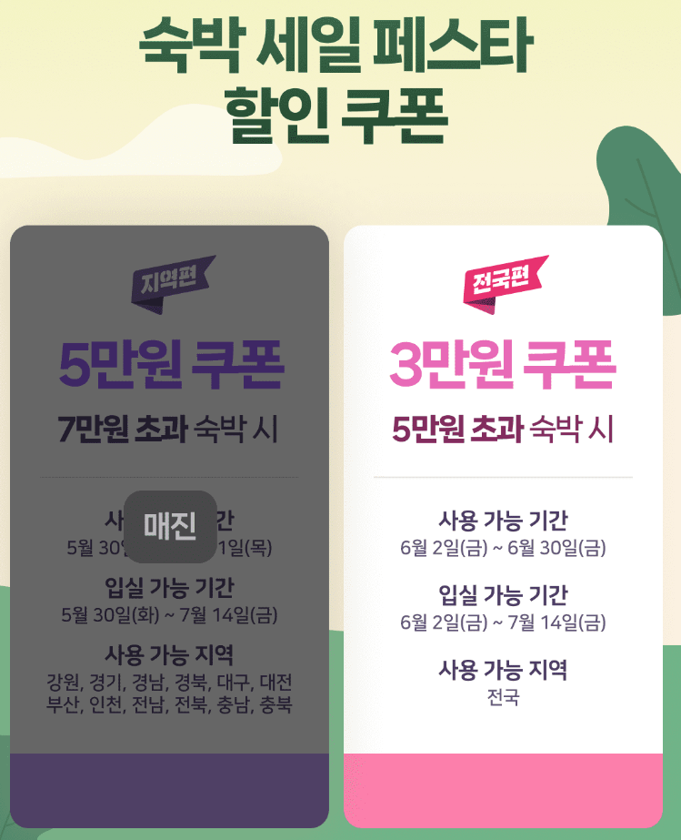 이 쿠폰은 온라인 여행사를 통해서 5만원 초과 숙박상품 구매 시 3만원을 할인받아 전국 어느 지역이나 사용하실 수 있습니다. 대한민국 숙박세일페스타를 통해서 발급되는 쿠폰은 약 62만 장이지만, 기간별로 나누게 되어 있어서 추석연휴에는 30만 장이 풀릴 예정입니다. (기간 9월 27일 ~ 10월 15일)